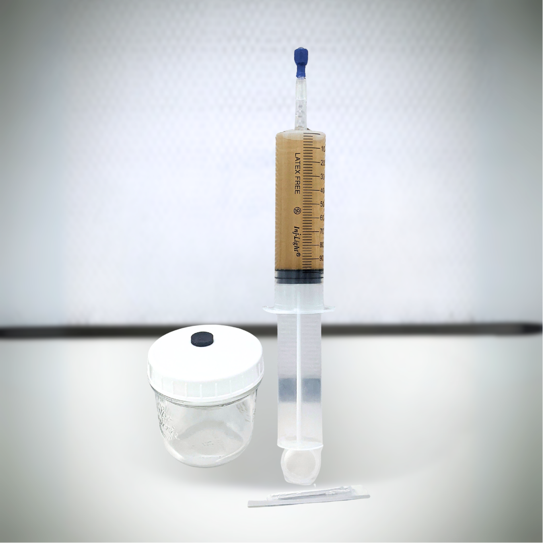 Procedura: sotto cappa sterile, sterilizzare la superficie del tappo con alcool, inserire l’ago attraverso il silicone e iniettare 1–10 ml di LC a seconda del volume del barattolo. La porta in silicone si richiuderà dopo il ritiro dell’ago.