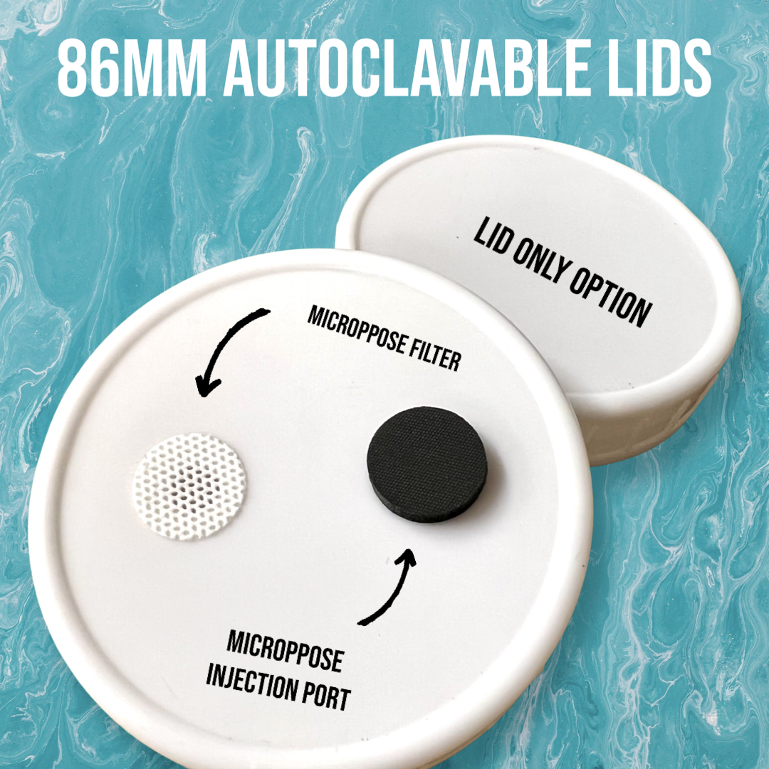 Tappi modificati con due fori: uno piccolo sigillato con silicone per la porta d’inoculo; uno più grande riempito con polyfill o altro materiale filtrante per lo scambio gassoso.